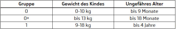 Die Kindersitze sind in 5 Gruppen eingeteilt: